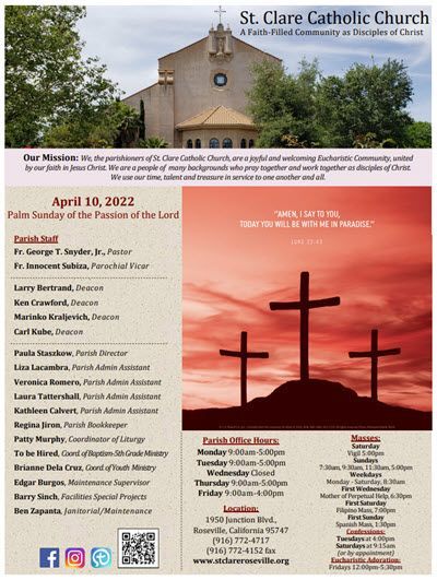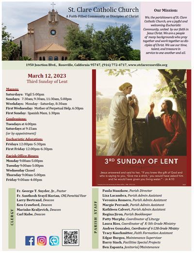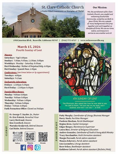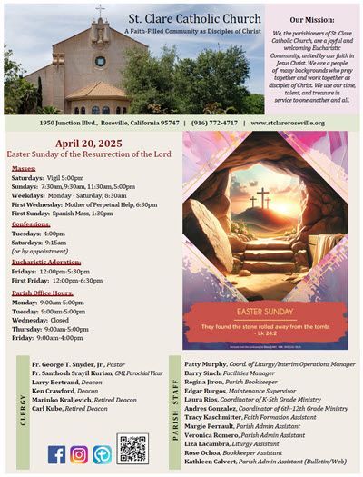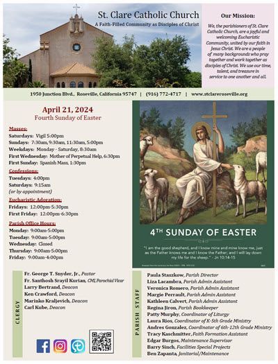 Parish Bulletin at St. Clare Catholic Church keeps parishioners informed about upcoming events, ministries, and important announcements. The bulletin is a helpful resource for staying connected to parish life and the activities of the St. Clare community.